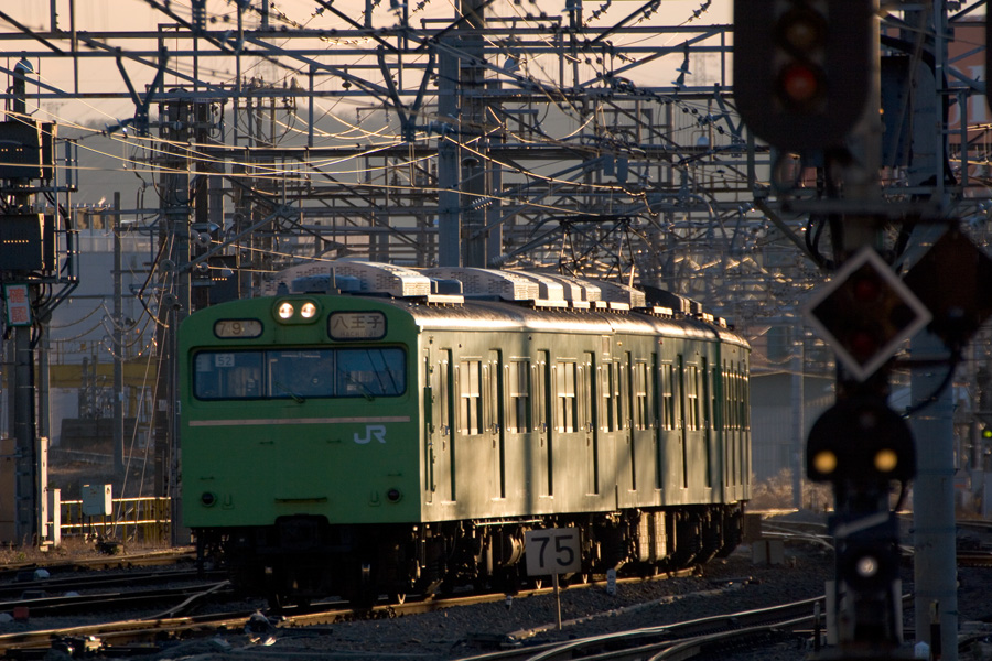 朝日を浴びて輝く103系ハエ52編成。古い車輌だと画になると思うのは、筆者のえこひいきか? 最近のステンレス車輌、塗装しなくても痛まないのは理解できるが、ラッピングのラインだけじゃ寂しすぎる。 八王子駅にて 20D + EF100-400 F4.5-5.6 400mm 1/1000sec F5.6 ISO 400 RAW現像>リサイズ900x600 |