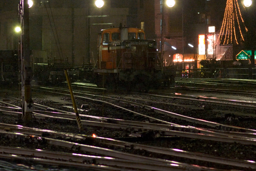 八王子駅から暗闇の中へ消えていくEH200 1号機。 F2.0の明るさを誇るEF100mmは夜景もお手の物。っていうか、もともと星を撮るために買ったので、そうでないと困るのだが(^^; でもこれだけの夜景が手持ちで撮れるのは、撮ってる本人でもびっくりする(笑) 八王子駅にて 20D + EF100 F2 100mm 1/80sec F2.0 ISO 3200 RAW現像>リサイズ900x600 |