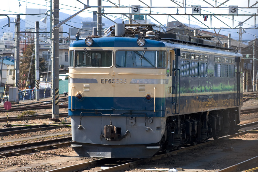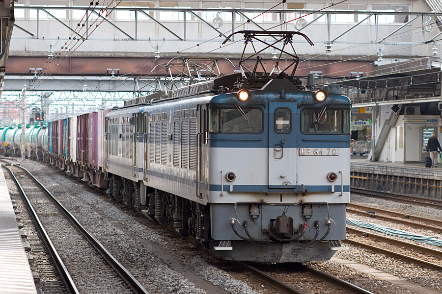 こちらが本命の下り貨物。EF64 59号機と52号機の重連。59号機はパンタグラフが1000番台と同じ小型のタイプに換装されている。 八王子駅にて 20D + EF100 F2 100mm 1/320sec F4.0 ISO 100 RAW現像>レベル補正>トリミング>リサイズ900x600>アンシャープマスク |