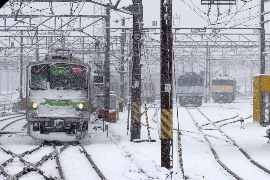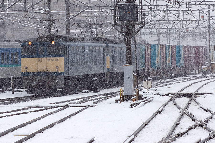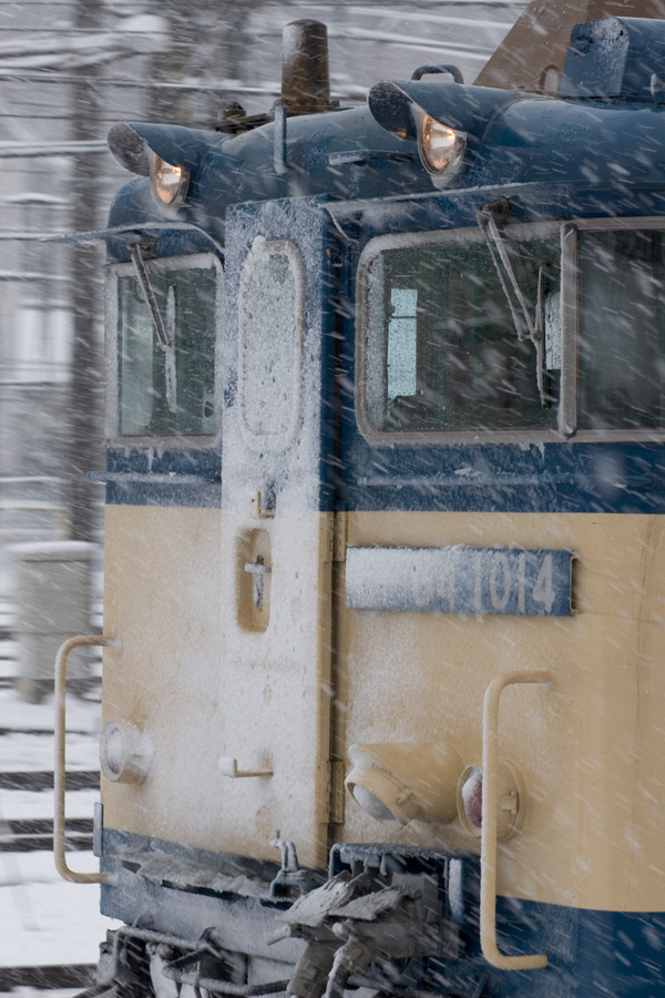 雪の中を疾走するEF64 1014号機。SLもそうだが、機関車というやつは雪が似合う。やっぱり雪の日もがんばって働いているという感じがするからだろうか? とにかくカッコイイ! 八王子駅にて 20D + EF100 F2 100mm 1/100sec F8.0 ISO 100 RAW現像>リサイズ600x900 |