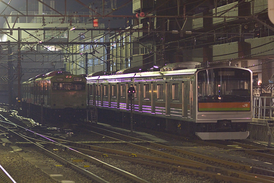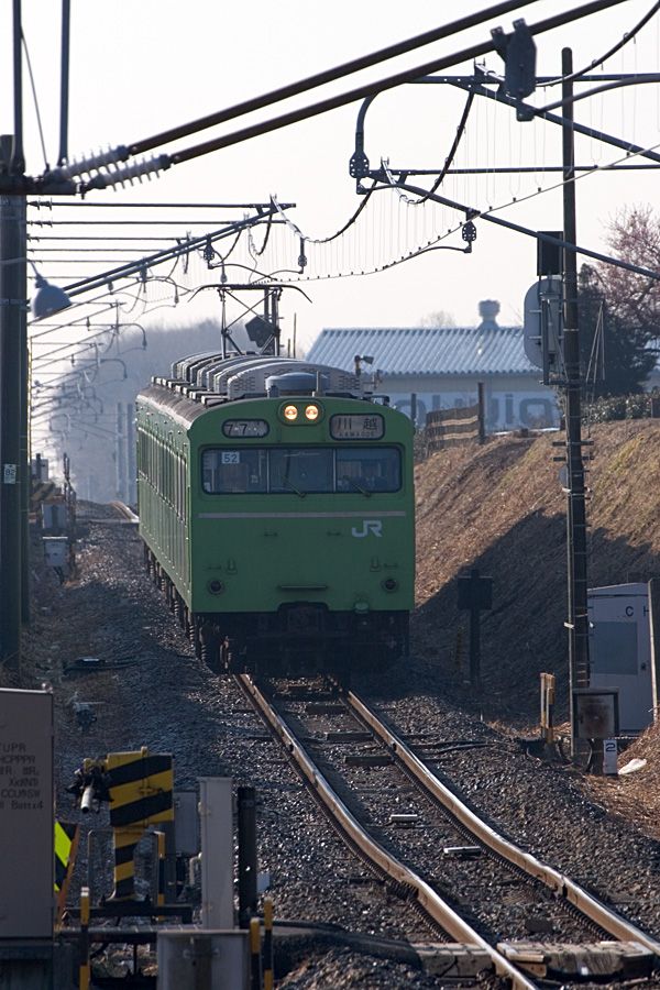 高麗川駅でしばらく休憩を取る103系56編成(奥)と平日に2本走っている青梅線経由東京直通の201系10編成(手前)。朝焼けが鮮やかで、今日はよい天気になりそうだ。 高麗川駅にて 20D + SIGMA18-50 F2.8 EXDC 18mm 1/160sec F8.0 ISO 800 RAW現像>リサイズ900x600>アンシャープマスク |