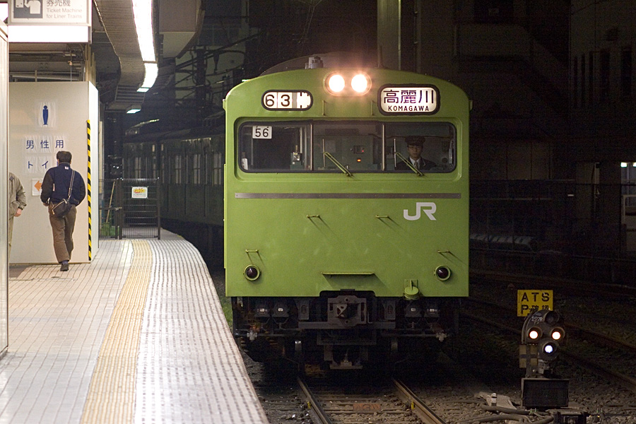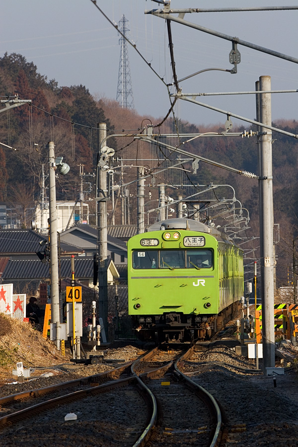 昨日停まっている列車を見て、もう引退が近い103系56編成を撮るべく、2番列車にあわせて早起きしてみた。これは0510に待避線からホームへと入線してくるところ(^^; さあ、こいつに乗ってプチ撮影旅行としゃれ込もう♪ 八王子駅にて 20D + EF100 F2 100mm 1/160sec F3.5 ISO 1600 RAW現像>トリミング>リサイズ900x600>アンシャープマスク |