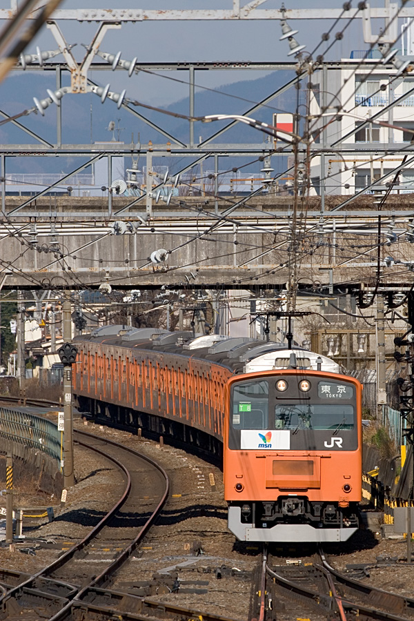 MSNの広告が入った中央線201系T8編成。MSはよく広告を出している。非常に普通なデザインなので「おお〜!」というようなインパクトはないが、初めからそういう塗装かと思わせるぐらい自然にとけ込んでいる。 八王子駅にて 20D + EF100-400 F4.5-5.6 300mm 1/500sec F10 ISO 200 RAW現像>リサイズ600x900>アンシャープマスク |