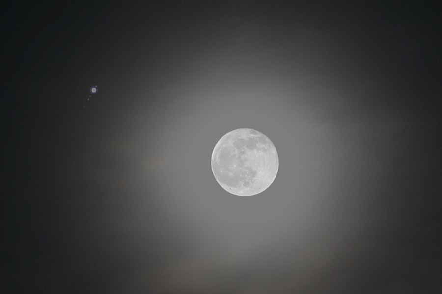木星と月が接近。ちょっと雲が出てぼやーっとなってしまったが、それでも木星のガリレオ衛星が4つとも写っている。なお、月と木星では明るさが全然違うので、露出の異なる2枚を合成した。 自宅付近にて 20D + EF100 F2 100mm 1/2,1/500sec F2.0,5.6 ISO 100 RAW現像>トリミング900x600>コンポジット |