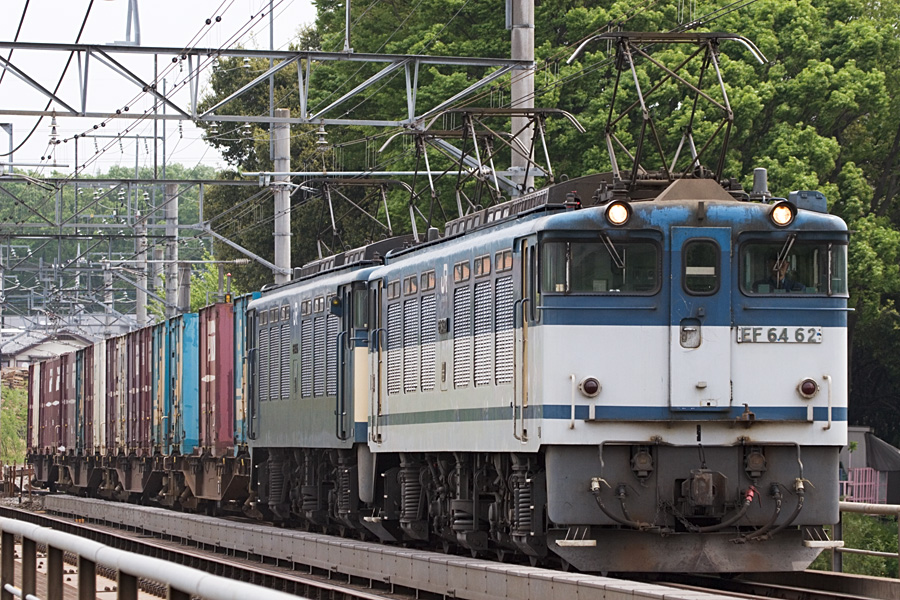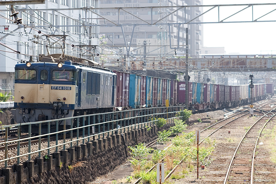 八高線の103系は朝の仕事を終えるとしばらく拝島でお昼寝になってしまうので、いつもの貨物列車を撮るために移動。鉄橋ポイントでのEF64