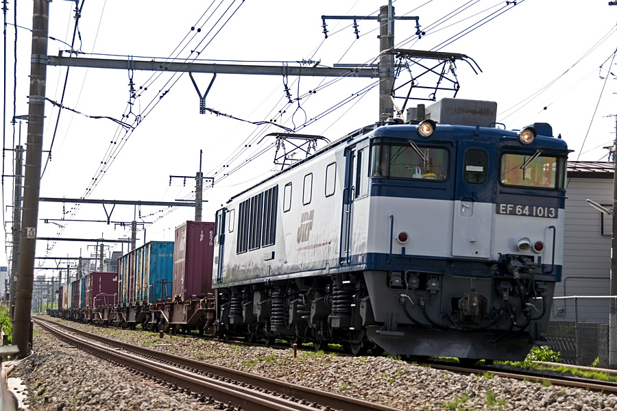 手すりが銀色のEF64 58号機がついに先頭車両でやってきた! …が、思いっきり曇り(T_T) コキ(コンテナ車)とタキ(タンク車)の混合比もいいあんばいなのに〜! 次位は最近コンビを組んでいる55号機。 西八王子駅付近にて 20D + SIGMA18-200 F3.5-6.3 DC 200mm 1/400sec F6.3 ISO 200 RAW現像>リサイズ900x600>アンシャープマスク |