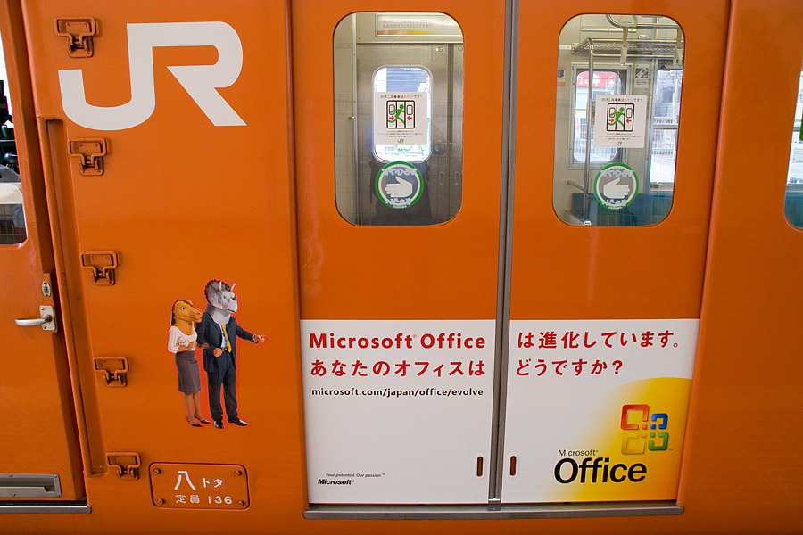 Officeラッピングに変身。前面のロゴはいつものOfficeと同じだが、側面のデザインが変わっていた。なぜ恐竜? 西八王子駅にて 20D + SIGMA18-200 F3.5-6.3 DC 18mm 1/40sec F8.0 ISO 400 RAW現像>リサイズ900x600>アンシャープマスク |