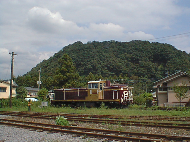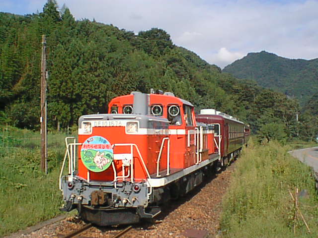 わたらせ渓谷鐵道の広告塔、トロッコ列車。いつもは茶色の機関車がひいているらしいのだが、今回見たのはこれ。話によるとこのDE10はJRからの借り物とか。(神戸付近) |