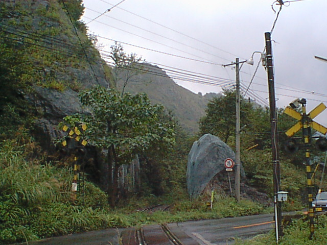 間藤は今でこそ終点だが、本来はこの先の山の裏にある銅山の表玄関まで続いている。まだ線路も敷かれたままで、列車を遮っているのは一本の木材だけだ。しっかし、終点は絵になるね。天気もあまり良くないので、なんとなく寂しい写真になってしまったが、それはそれで終点の哀愁が漂っていていいかも。