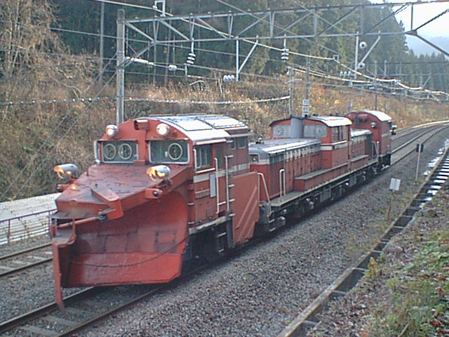 DE10(?)の前後に除雪ユニットを結合した除雪車。 (板谷駅付近にて) |