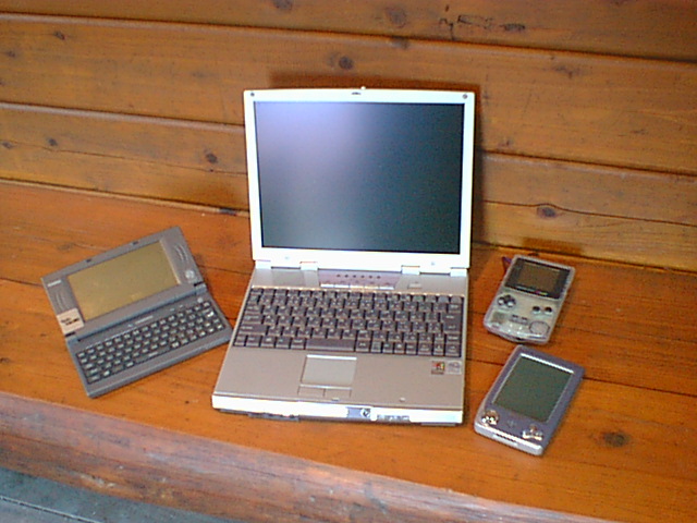 今回の旅に持ってきた電子機器。…我ながらバカだと思う(^^; 右下がCASSIOPEIA E-700。右上はゲームボーイカラー。 (板谷駅待合室にて) |