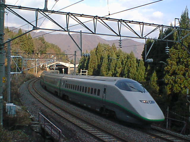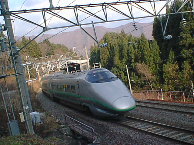 新色の400系。最初車体自身も白くなるのかと思ったが、ラインをE3と同じデザインにしただけのようだ。ラインが入ったことで「新幹線」という感じがする。ただ、窓枠の黒がなくなったため、少しりりしさに欠けるか? 奥に見える雪よけが板谷駅。 (板谷駅付近にて) |