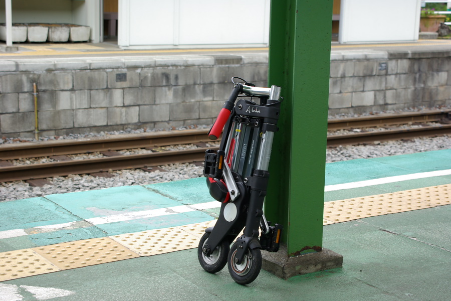 筆者は普段、鉄道+徒歩、またはどうしても機材が多いときや車中泊がある時には鉄道+車を利用していた。が、どちらも一長一短。徒歩では駅間をせいぜい1つ2つ歩く程度が限界。車では大きな道沿いのポイントしか探せず、また駐車の問題もある。それに運転しながらポイントを探すのは危ないし、何より筆者は車を運転するのが好きではない(^^; そんなわけで、鉄道+折りたたみ自転車というたびてつスタイルは過去にも何度か考えたことがあった。しかし、折りたためるとは言え、そのサイズと重量から、非現実的であるという答えに至っていた。しかし、このA-bikeは過去に導き出したその答えを覆すほどの小ささと軽さを備えていた。