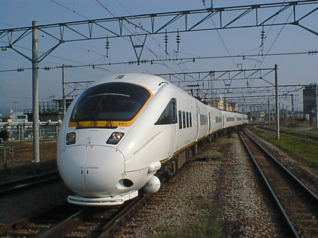 通称「白いかもめ」こと885系。 塗装でなく、金属パーツでかもめのシンボルがかっこいい。シートはゆったりした配置になっており、しかも革張り! 中のスペースを重視したためか、ドアは1車両にひとつしかついていないが、その分を携帯電話スペースなどに確保するなど、時代のニーズを的確に捉えた最新型♪ 先頭車両の下側についている球体がとても気になる。もしかしてレーダー!?(笑) (鳥栖駅ホーム端にて) |