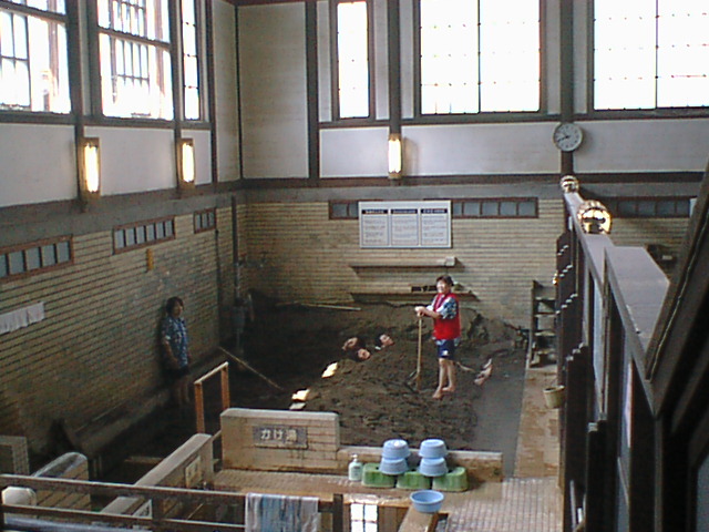砂風呂のあと、普通の温泉へとはしごする。こっちもものすごいノスタルジック…。そういう造りなので洗い場はない、というか蛇口もない。とはいえ、頭も洗いたいし、ひげも剃りたいので、洗面器だけで用を足す。こんなことしてるやつはいねー、と思ったのだが、地元民にとっては当たり前の行動らしい。おかげで白い目で見られずにすむ(笑) それはそうと、この温泉、熱いぞ!