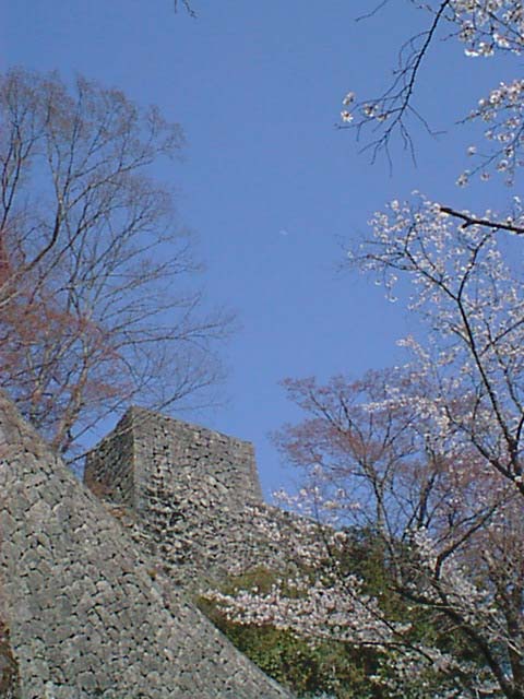 ↑キハ200系。夕日を浴びた車体は、より赤く輝く。JR九州の車両はカラーリングがカッコイイ。 (宮地駅構内にて) ←岡城趾の石垣を見上げて。荒城の月ということで、画面上から2/3の中央部に月を入れてみたんだけど見えるかな? (岡城趾にて) |