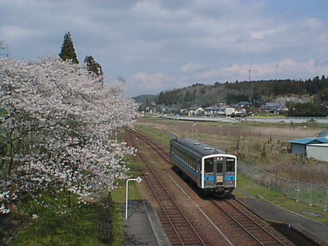 のんびりと各駅停車に揺られるうち、桜の綺麗な駅を見つけた。さっそく途中下車(笑) 駅名は菅尾(すがお)。無人の小さな駅だが、桜は立派である。幸いなことに、大分行きの列車がすぐにくるようなので、桜をバックに撮影する。やってきたのは黄色のDC125。青空、桜、黄色の車両のコントラストがよい。って、昨日も同じ文を書いた気がする(^^; しかし架線がない分、今日の方が断然よい。単線ディーゼルの勝利!