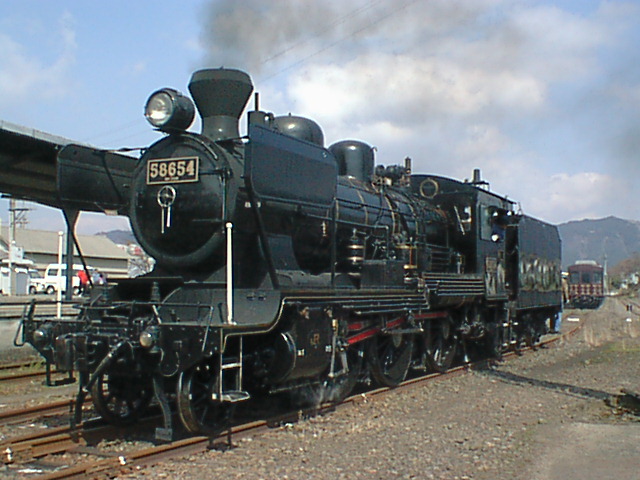 SLあそBOY。連結作業中、間近を通り過ぎる大迫力のSL。ちなみに写真は後ろ向きで走っている時のもの。奥に見える茶色のがアメリカ風客車である。 (豊肥線宮地駅構内にて) |