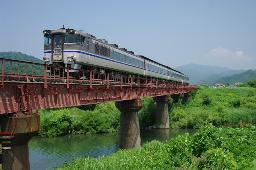 特に時刻表を見ていた訳じゃないのだが(<見ろよ!(^^;) 目を付けていた鉄橋で待っていると、丁度キハ47の初号機がやってきた! いやっっほーい!(笑) あとで写真を見てみたら、ペアを組んでいる10号機のほうは、更新車ではないようで、ドアがボタン開閉式になってなく、エアコンも集中型になっていないことに気づいた。そっかぁ、ボタン開閉式のキハ47には戸袋のところの窓がないんだな。窓枠も違うし。 |