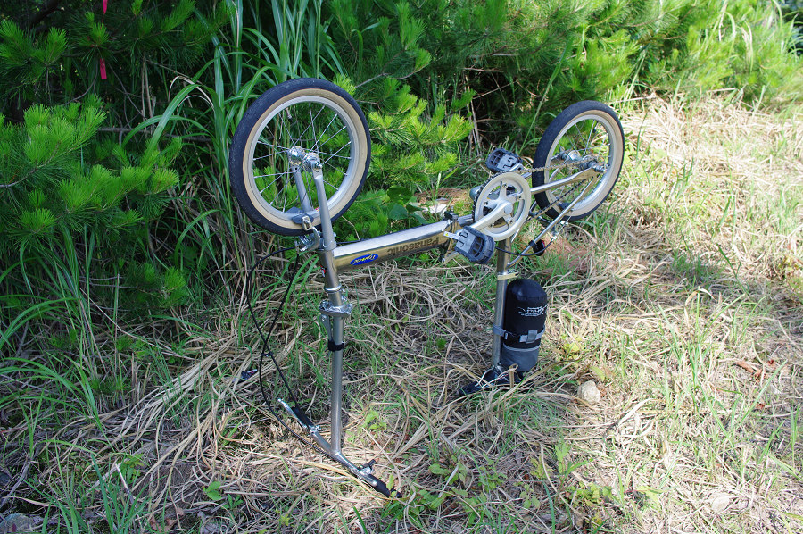 トレンクル、走行性能は予想以上のものがある。ただ、スタンドがないので撮影中に駐めておくときにちょっと困る。何か寄りかからせるものがあればいいのだが…。と、ある方法で3点支持で立つんじゃないかと思い立つ! はい!立ちました!(笑) そこの君、笑ってるけど、本人は割とまじめに考えてるんだよ!? |