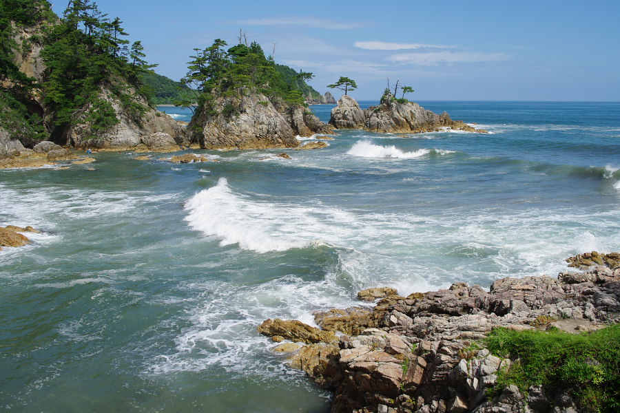 上の写真の岩の向こう側は磯になっていた。朝一の列車に乗ってて、一緒に東浜で降りたおっちゃんがここで釣っていた。 韓国付近にいる台風の影響でちょっと波が高い。 |