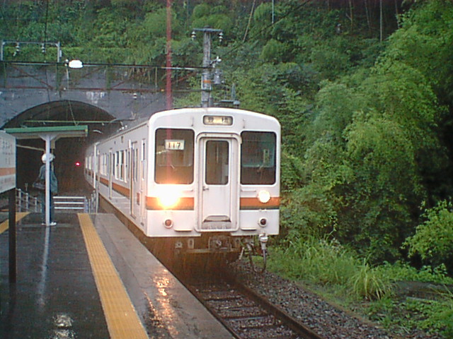 着いた大嵐駅ではちょうど列車が行き違うところ。このあたり、さっきも行ったようにトンネルだらけなので、こんな小さな駅でも入れ違えることができるようになっている。しかしあまりにも大嵐駅の両側にトンネルが迫っているので、トンネルの中も少し複線区間があり、トンネルが広く作ってある。ちょ〜っと計画を間違っているんじゃないかなぁ。