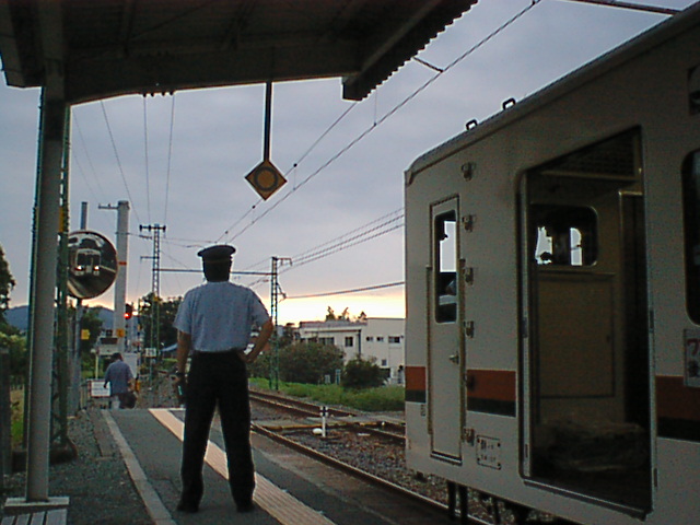 飯田線の夜明けぜよ! なんて言っていないことは確かだが、朝焼けの中列車の入れ替え待ちの車掌さん。