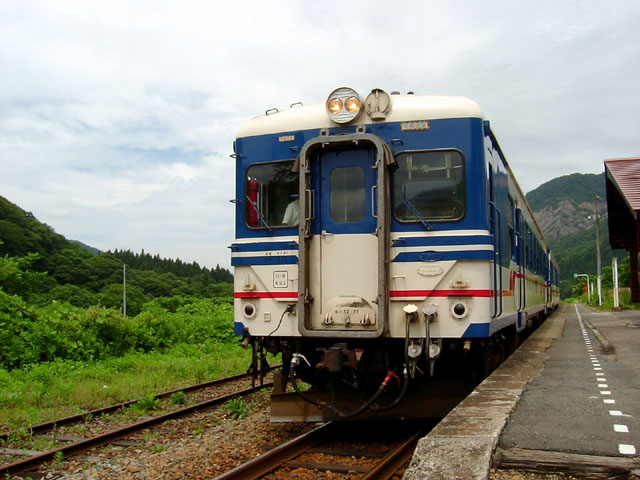 次に乗る列車はキハ52・47形コンビ。キハ52形は見慣れない車両で、現地ではどういう列車がわからなかったが、後で調べてみると、勾配区間用にエンジンを2基搭載したハイパワー形の車両であることが判明した。山田線にあるというのは知っていたが、米坂線にあるとは思わなかった。この塗装のキハ52形はここにしかないかもしれない。