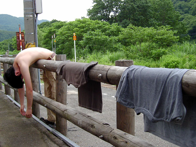 伊佐領駅で2本目の上り列車を待つ三人。汗だくのシャツを脱いで柵に干し、すっかり自宅のようにくつろぐ3人。のどかな時間がゆっくりと過ぎていく。ぼ〜っと待つのもローカル線の楽しみのひとつ♪