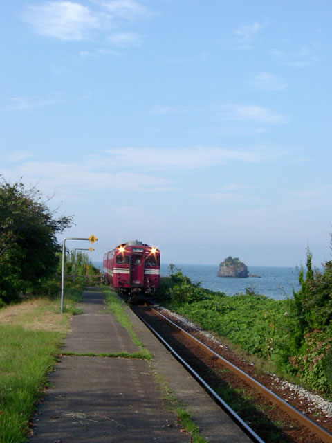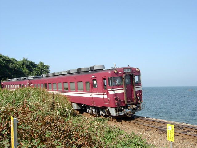 火を落として、明日に備えるキハ48。 山間の終着駅にただよう郷愁と哀愁。そして朝の一番列車になるとすがすがしさへと変わっていく。 こういう駅って好きだなぁ☆ (猪谷駅にて 2002.08.27) 右→ 海とキハ58。山間部のローカル線をテリトリーとするディーゼル車が海沿いを走ってるところは貴重かもしれない。 エンジ色だと、ローカルっぽさが増す感じがする。 (越中国分駅にて 2002.08.29) |