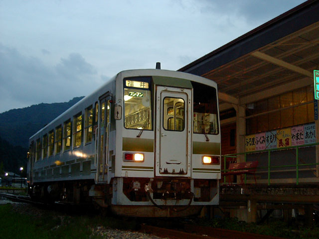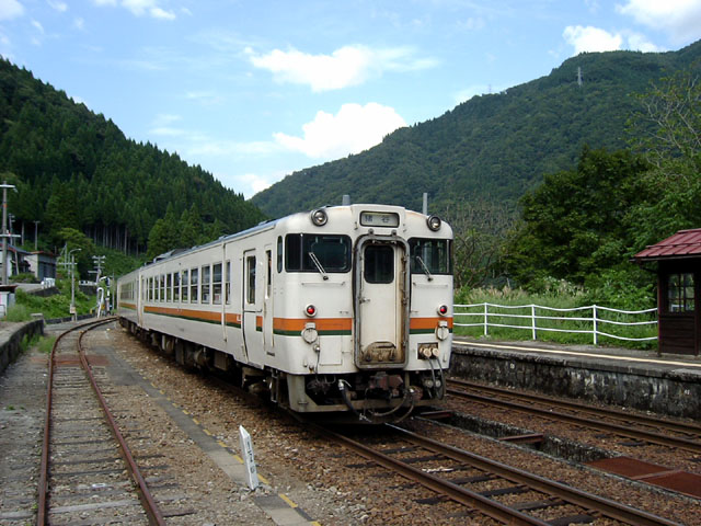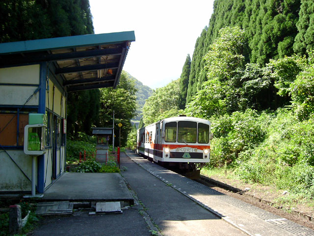 緑鮮やかな山中の駅に到着した、神岡鉄道おくひだ1号。窓から入ってくる山の風は、クーラーなんかよりもずっと心地よい☆