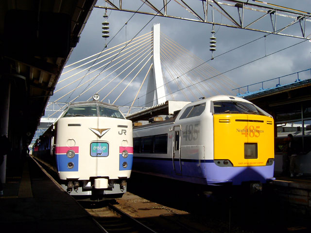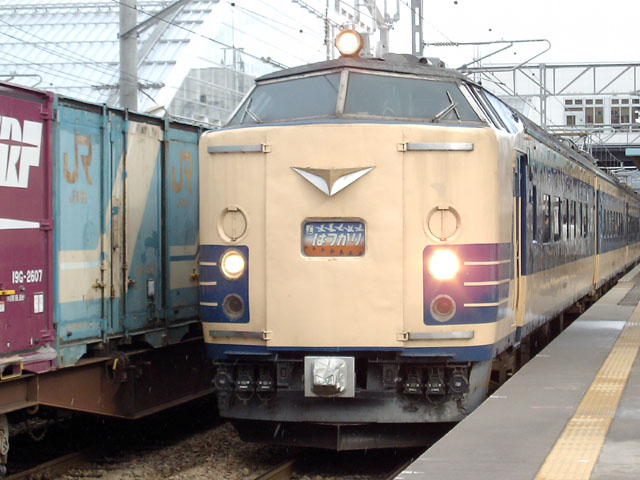 そして、ようやく入線してきた583系の撮影に成功。このページの最初の一枚がそのときの写真。583系の向こう側に見えているのが憎き貨物列車である(笑)