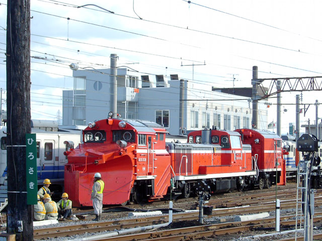 弘前駅で筆者らの目を惹いたのは赤いディーゼル機関車。前後に除雪ユニットを連結したDE15だ。