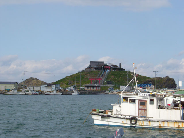蕪島(かぶじま)の遠景。うみねこの繁殖地で天然記念物に指定されている。うみねこの繁殖期は5〜7月なので、この季節はなにもない。観光客もおらず寂しい限り。
