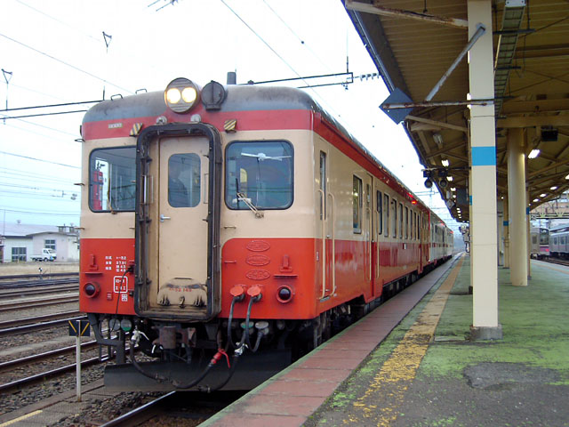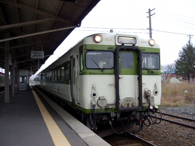 ところで、最初の旅程では今日は群馬で165系の急行草津に乗るということになっていた。この列車、特別列車なので全席指定なのだが、席が離ればなれでしか取れなかったので、予定を変更して本日は花輪線ぶらり旅とあいなったのである。つい2ヶ月前に来たばかりという話もあるのだが、キハ52がいるし、国鉄色はいるし、窓は開くしと、素晴らしい路線なので何度来ようとかまわないのである。今日も寒いので窓は開けないけどね