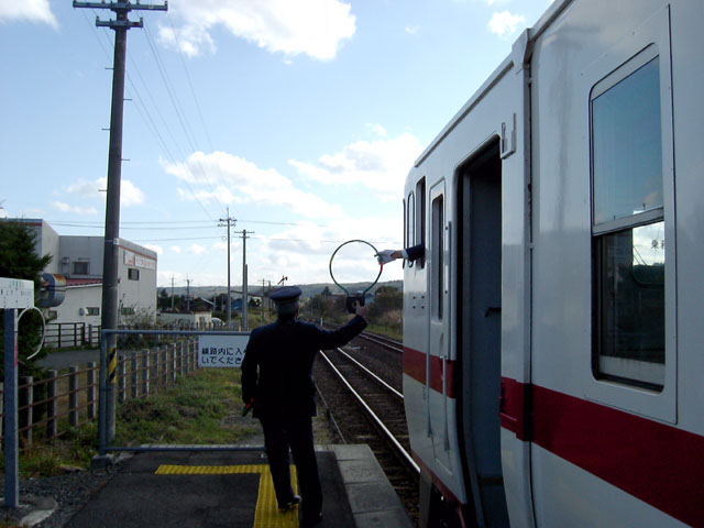 タブレットを受け取る駅員。タブレットを確認し、手動で信号機を切り替えて初めて列車が次の区間に進入できる。JR東日本で、現在もタブレット交換を行っているのは八戸線のみである。