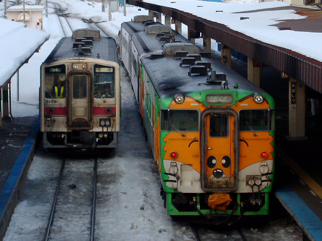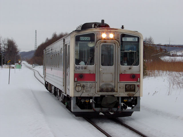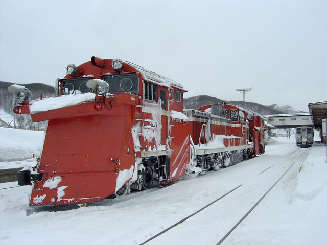 ![]() 留萌線の終着駅、増毛で折り返しを待つキハ54 529。手前に写っているのは車両止めの標識。増毛まで来るのは一日6往復のみ。しかも午前中は0730の一本だけと、かなりのローカルぶりだ。しかし、留萌より増毛側は日本海沿いを行き、景色ががらりと変わるので是非ともご覧あれ。 レールが他にないので、SLすずらん号はバックで戻るのか? (増毛駅にて 2003.03.04) |