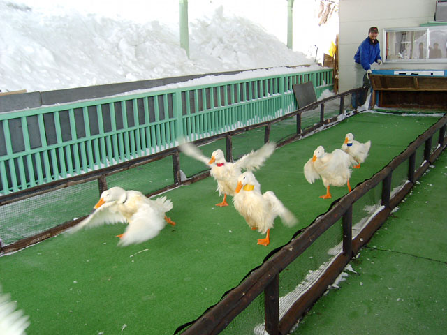 最初に見かけたのはアヒルレースだったが、アヒルは奥の小屋のなかで振るえていた。レースをするトラックの柵には寒さのためレースを中止しています