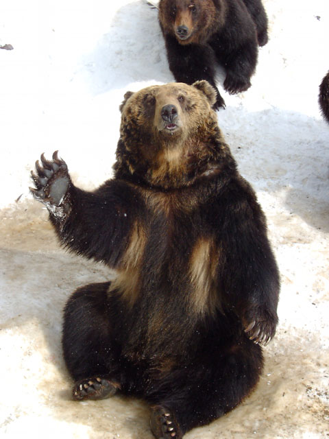 そしてもう一つ、アピール合戦が行われる。観光客がエサを投げようとすると、手を挙げたりほえ声をあげたりして観光客にアピールをするのだ。仕込まれた物かどうかはわからないが、それぞれの熊によってアピールの仕方が違う。ボスっぽいのは片手をあげて「へい!パス!」ってな感じなのだが、その後方に陣取る熊は日本足で立ち上がって両手を口元に持っていき、昔なつかしブリッコポーズを取る。ボスの後方でエサをもらうのは大変なようだ。