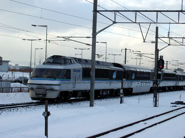 キハ183系クリスタルエクスプレス。オホーツクなどのキハ183系の改造型と思いきや、同じエンジンを使ってるだけという全然別物らしい。確かに先頭車両の形状だけでなく、車両そのものの形状も違うような…。発見が遅れたので写真が遠目(^^;
