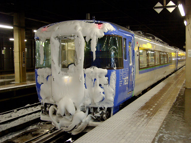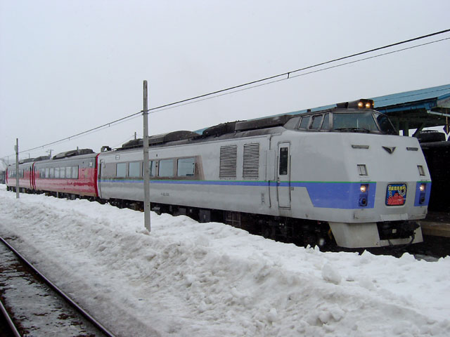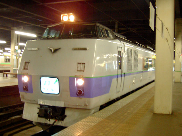 キハ183系 オホーツク9号。国鉄時代のオリジナル形状で、主に夜行に使用されている模様。北海道は広いので夜間移動できる夜行特急は利用価値が高い。宿代も浮く(笑)