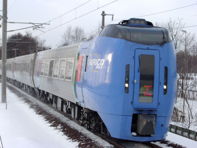 キハ281系スーパー北斗。横の英字はFURICO=振り子(笑) 運転席下のドアは連結時は通路となり、先頭車両の時は絶好の展望窓になる♪