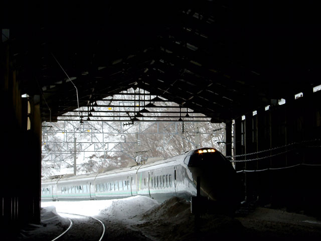 峠駅に停車した719系5000番台。雪避けのためのスノーシェッド内なのでトンネルのように暗い。列車の到着に合わせて、峠の茶屋の人が力餅を売りに来る。「ちか〜ら〜も〜ち〜!」のかけ声は今も昔も変わらないが、窓も開かず、停車時間も短いとあって、売り上げは厳しそう。 奥羽本線は山形新幹線と架線とレールが共用で、交流&標準軌(新幹線の幅の広いレール)になっている。もちろんこの719系はそこを走れる奥羽本線特別仕様である。 (峠駅にて 2003.03.15) |