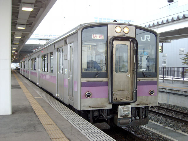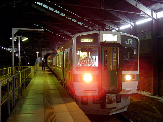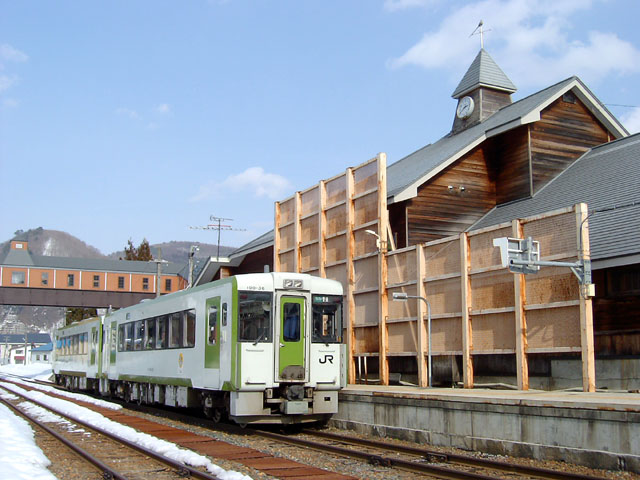 ほっとゆだ駅ですれ違いの列車を待つキハ100型。力強い走りを見せる、JR東日本の自慢の汽車である。その実力故に、こいつによって引退を余儀なくされる古い汽車が後を絶たず、汽車マニアには目の敵にされる事もある(^^; ほっとゆだ駅は駅舎内に温泉があり、途中下車するにはうってつけの駅だ。 (ほっとゆだ駅にて 2003.03.16) |