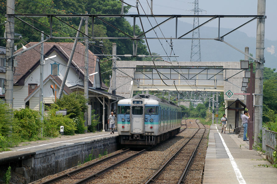 長野方面から登ってくる115系。スイッチバックしてから写真左に見えているホームへと入線してくる。新型車両の特急はもとより、この115系ですらスイッチバックなしで登っていける勾配だが、スイッチバックしないと駅に入線できないため、ここのスイッチバックは現存できている。(姨捨駅にて 2004.07.24) |