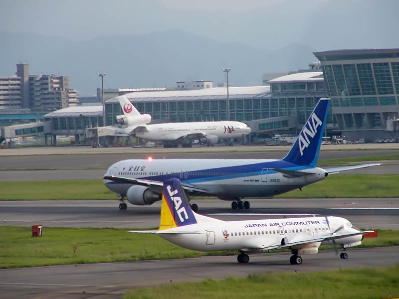 九州の離島に就航しているJACのYS-11(手前)。今回は改造によりなんとか退役をしのいだが、その日がそう遠くないのは明らかだ。退役前に乗りに来る計画が一応ある。その日まで、いやそれ以降も事故なく無事に退役することを願う。 一番奥のはこれまた退役が近づいているDC-10。写真の国際線はまだ大丈夫だが、国内線ではほぼ絶滅状態だ。なくなる前に乗りたい機種No.1! (福岡空港にて 2003.09.02) |