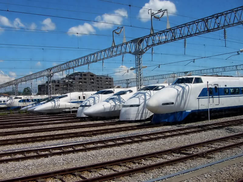 博多駅から博多南駅までは290円(運賃190円+特急料金100円)で新幹線に乗れるという特別区間。博多南駅は新幹線の車両基地なのだが、ここに回送するついでに客を乗せてしまうのでこの価格になっている。 その博多南駅ではこのように新幹線が所狭しと並べられ、出番を待っている。新旧の様々な系統の車両が整列しているのはまさに壮観の一言につきる! (博多南駅にて 2003.09.02) |
