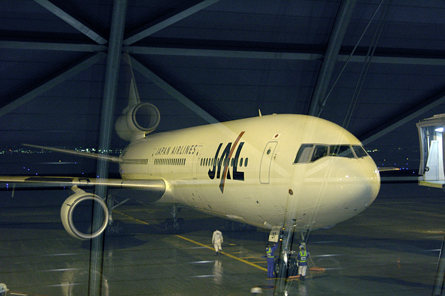 日が暮れる頃に関空に到着。これから乗るDC10が着陸してくるところを一目見ようと、展望デッキに行こうと思ったのだが、何故か展望デッキがない。うーむ、関空には展望デッキないのか?