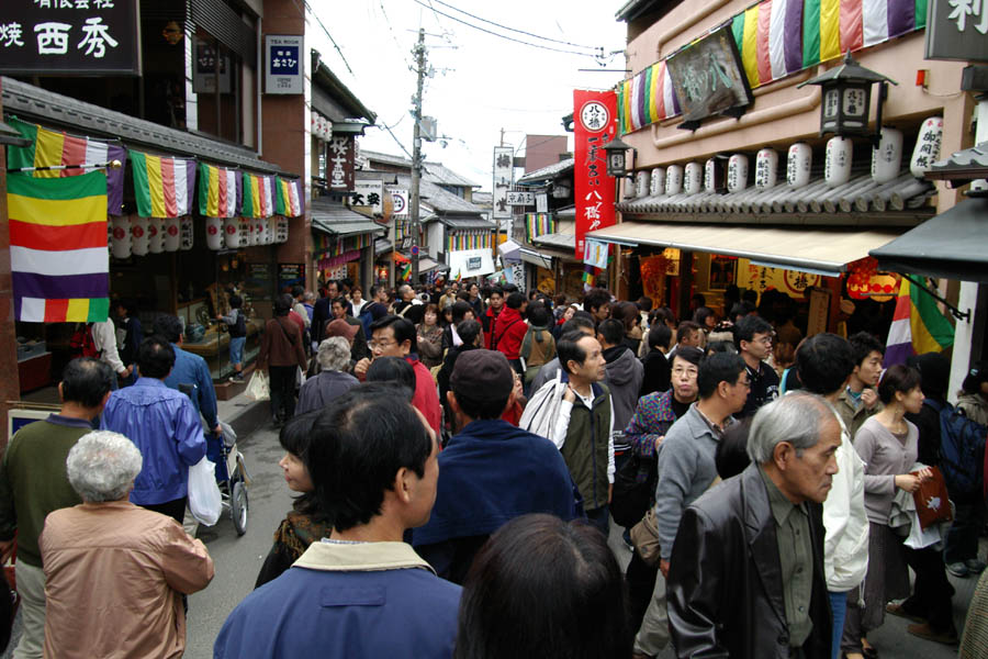 ← 清水の舞台はすごい混雑。木造の舞台が崩れてしまわないか心配になる。今年は暑かったせいで紅葉の具合はあまりよくないとのこと。 (清水寺にて 2003.11.23) ↑ ひと・ひと・ひと…。だが不況のせいか土産物屋の中は少しすいている(^^; (清水寺への坂にて 2003.11.23) |