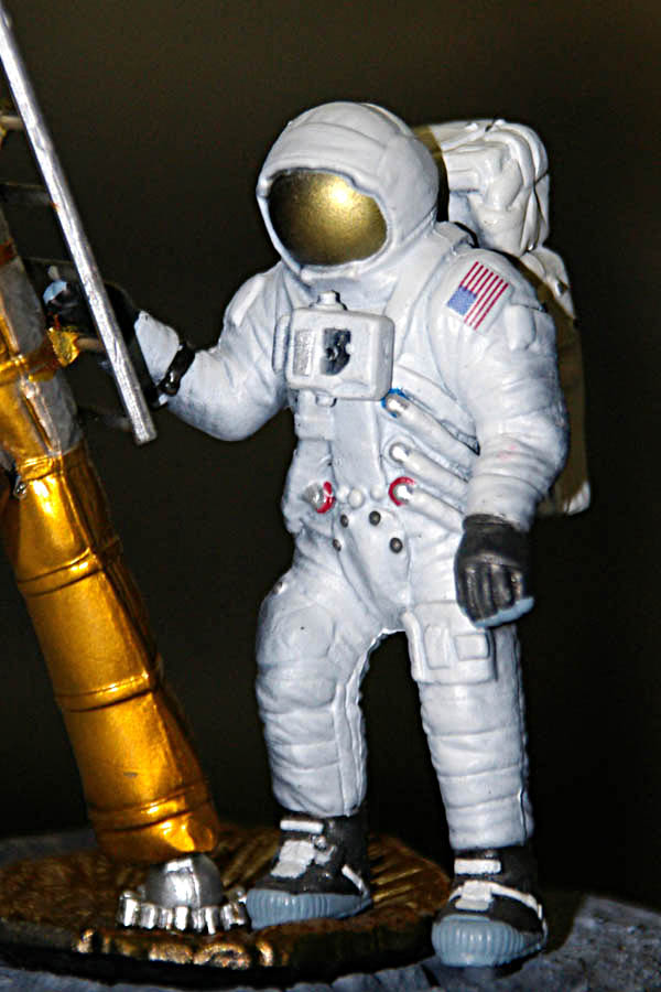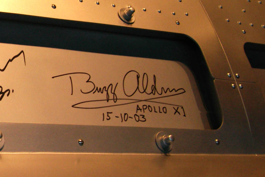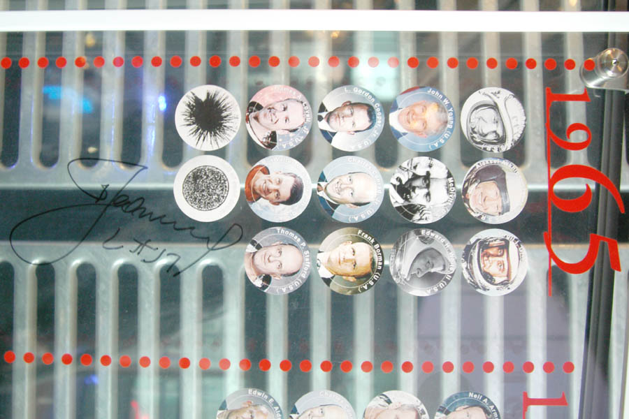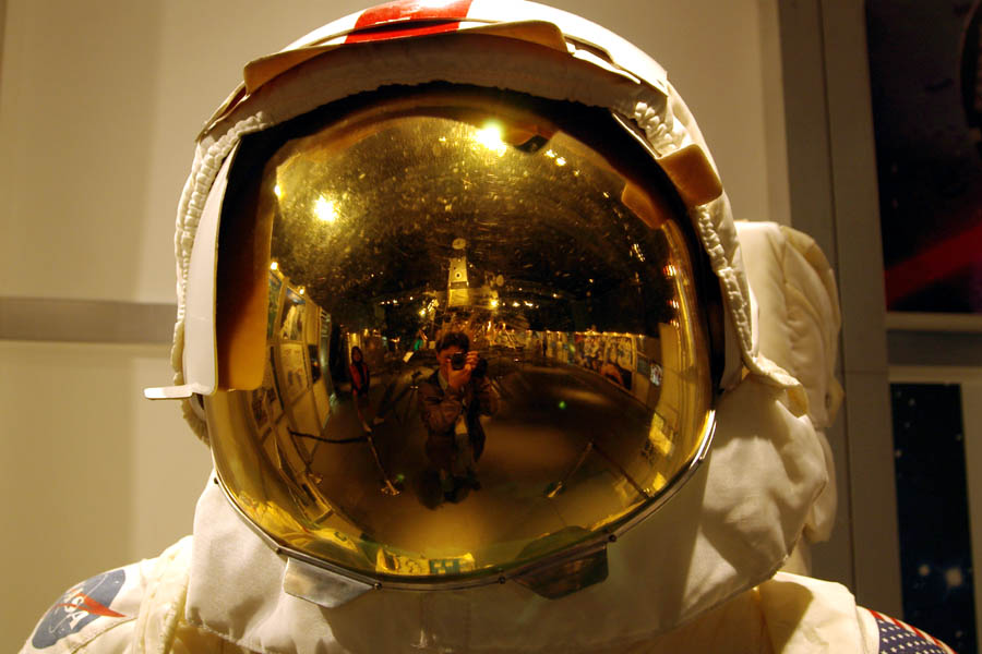 ←アポロ11号の月着陸船のはしご。このはしごから人類は月に最初の一歩を踏み出した。「これは一人の人間にとっては小さな一歩だが、人類にとっては大きな躍進である」というニール・アームストロング船長の言葉はあまりに有名だ。 (日本科学未来館にて 2003.11.30) ↑アポロ時代の宇宙服。まぶしすぎる太陽の光を遮蔽するために金が蒸着されたバイザー。カメラを構える筆者とその後ろの月着陸船が映り込んでいる。これを通して見た月世界や地球はどう見えたのだろう…。 (日本科学未来館にて 2003.11.30) |